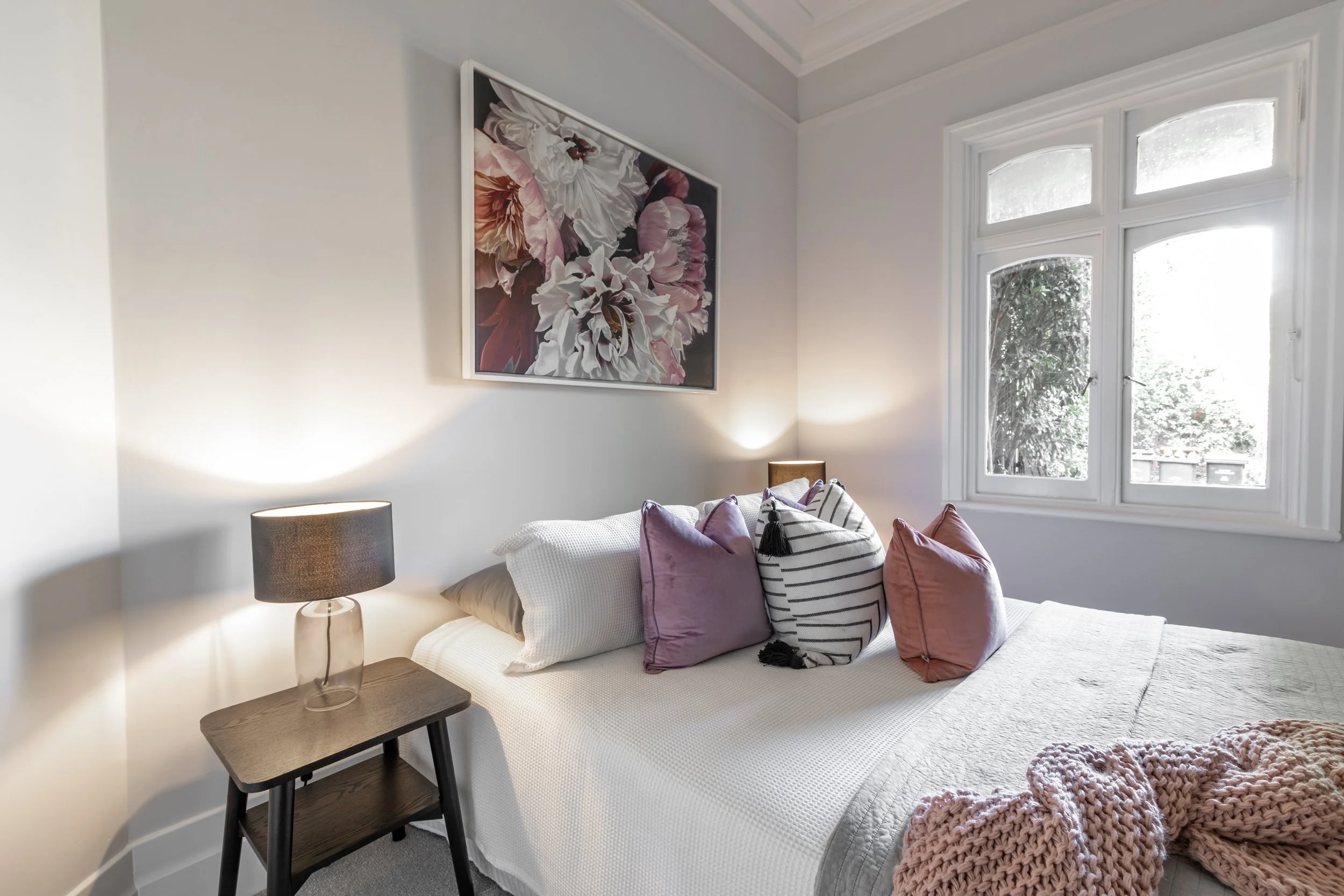 Natural textures, soft whites and graphic black accents weave through each space, from the crisp dual shower and kitchen to the cosy study nook. Heritage detailing is preserved and elevated with modern lighting and a restrained palette that enhances the home’s clarity.